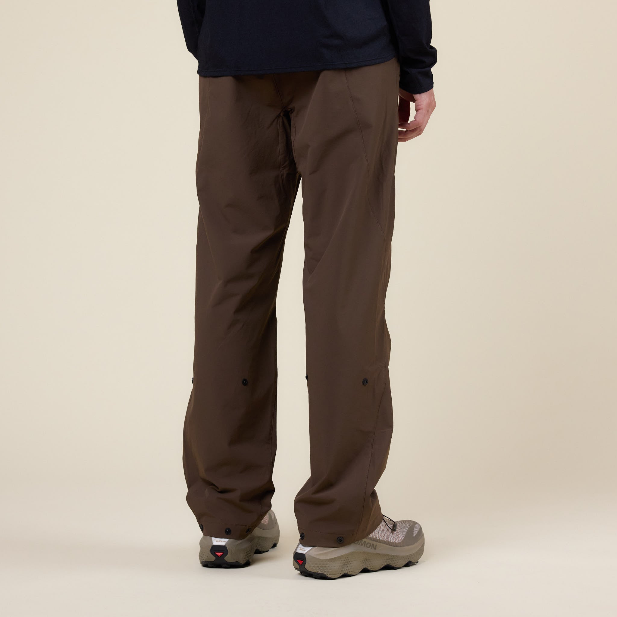 ふくらはぎから足首にかけて配されたスナップボタンは、余分な生地をコンパクトにまとめ、動作を妨げません。